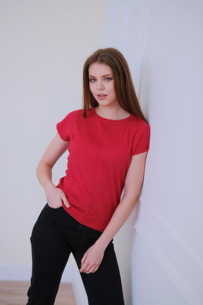 Лёгкий женский джемпер свободного покроя с коротким рукавом и круглым вырезом горловины. Джемпер украшен декоративными дырками и узкой полоской. В таком джемпере будет комфортно и на работе, и на прогулке, и на праздничном ужине. Прекрасное дополнение к гардеробу.