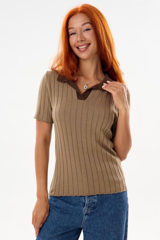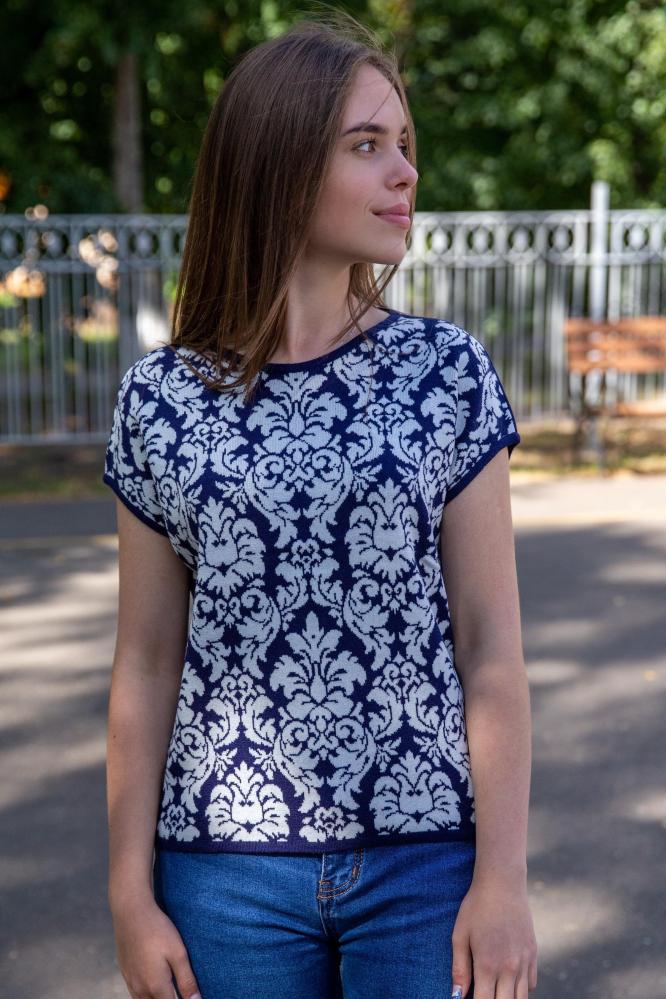 Вязаный трикотажный джемпер с коротким рукавом. Модель прямого силуэта со спущенным плечевым швом. Мягкий и приятный к телу материал подарит ощущение комфорта и уюта. Джемпер украшает красивый узорный рисунок на полочке.
