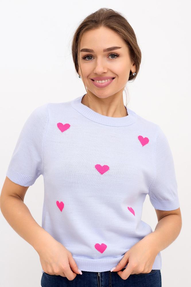 Милая и модная вязаная футболка Сердечки для нежных девушек. Мягкая, дышащая ткань приятна к телу. Короткие рукава, удобная длина футболки позволит носить ее каждый день с большим удовольствием. Футболка стильно смотрится на женской фигуре, легко сочетается как с брюками, так и юбками. Большой выбор ярких расцветок на любой вкус.