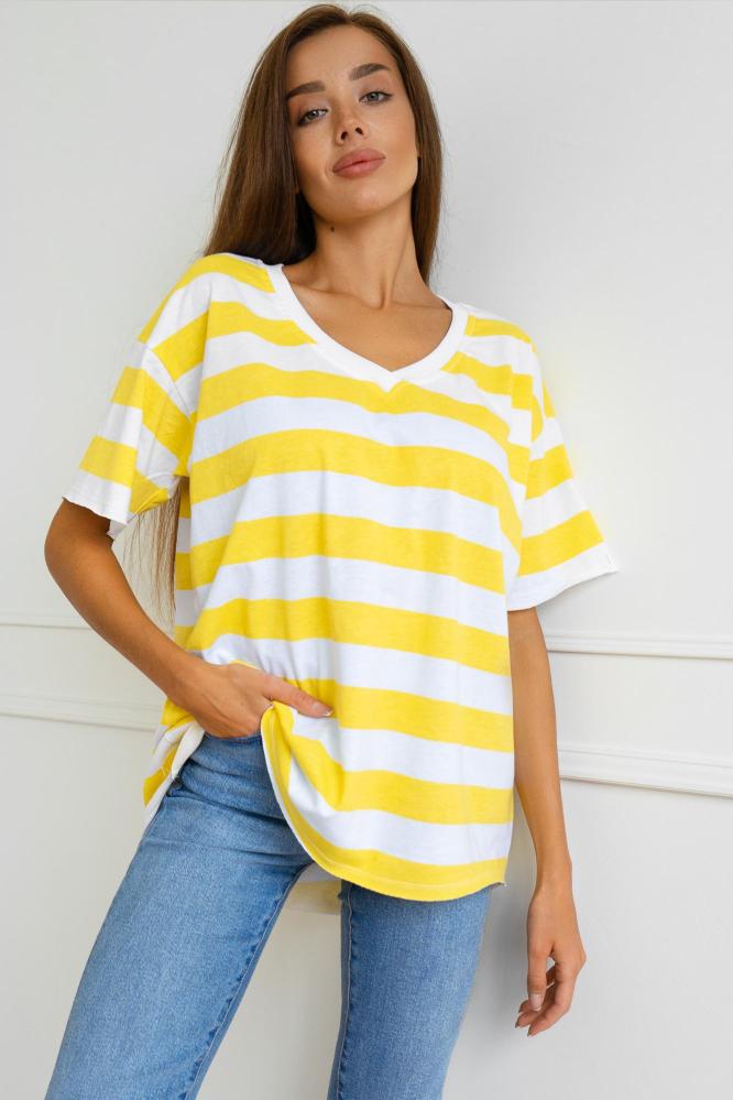 Футболка Фурор из 100% хлопка станет Вашим фаворитом в выборе повседневной одежды. Она отлично сочетается с шортами, брюками, бриджами и спортивной обувью. Воротник мысиком, короткие рукава, футболка немного укорочена спереди и удлиненная со спинки. Можно одевать футболку на одно плечо, что придаст особый шарм и романтичность образу. Удобная свободная посадка и красивая расцветка в полоску – делают модель очень привлекательной.