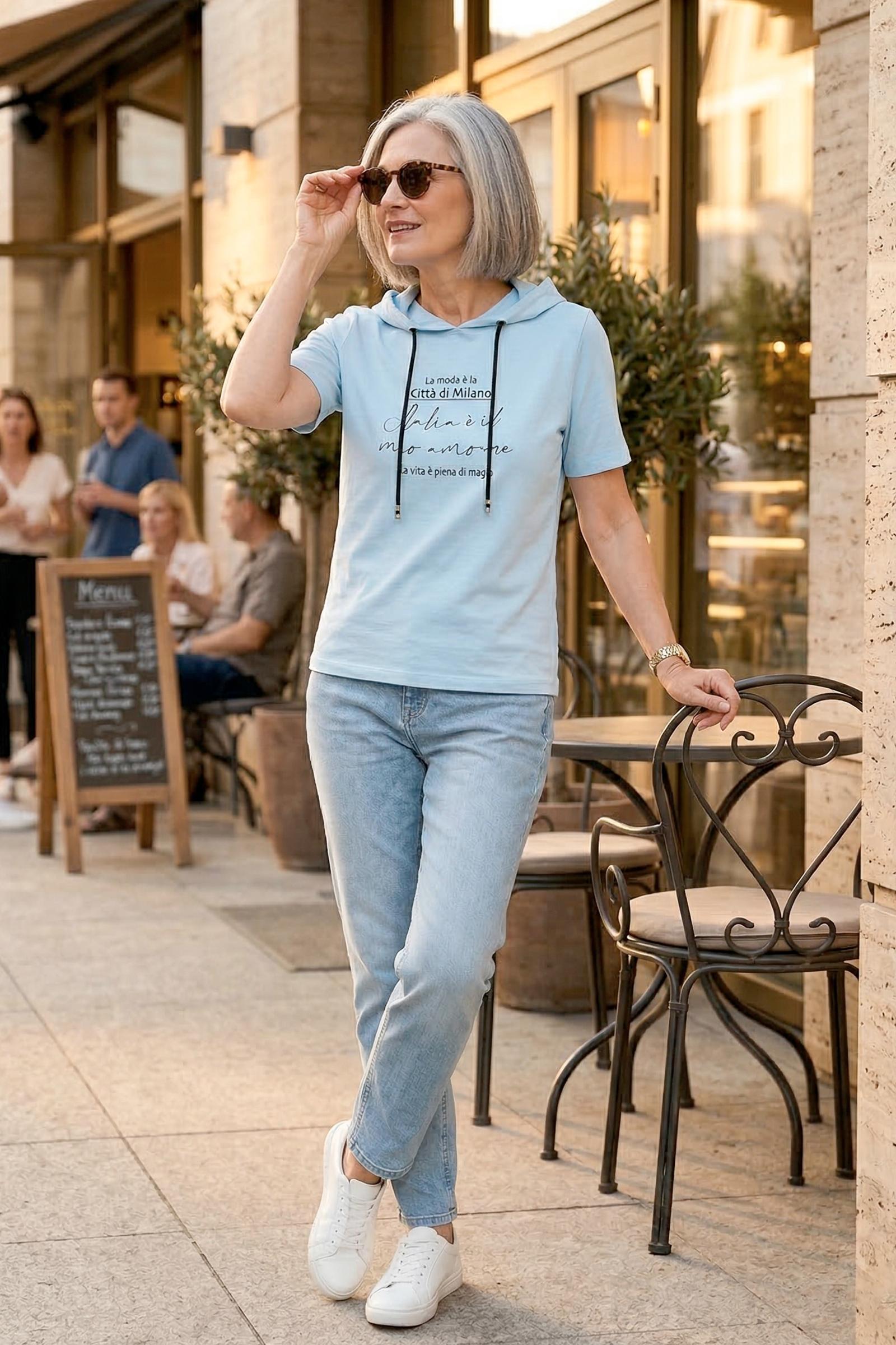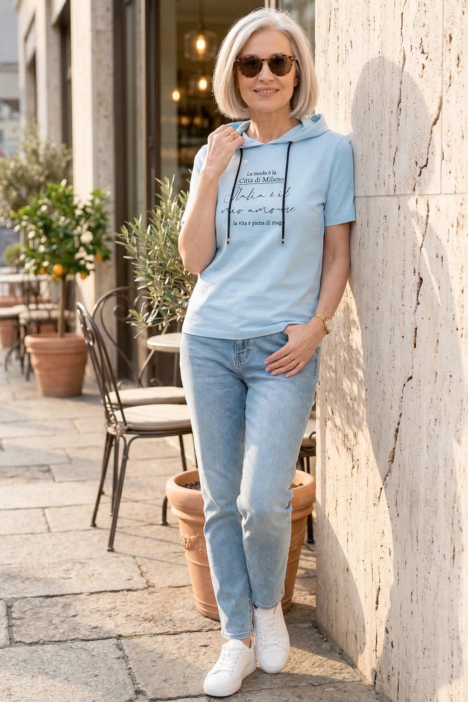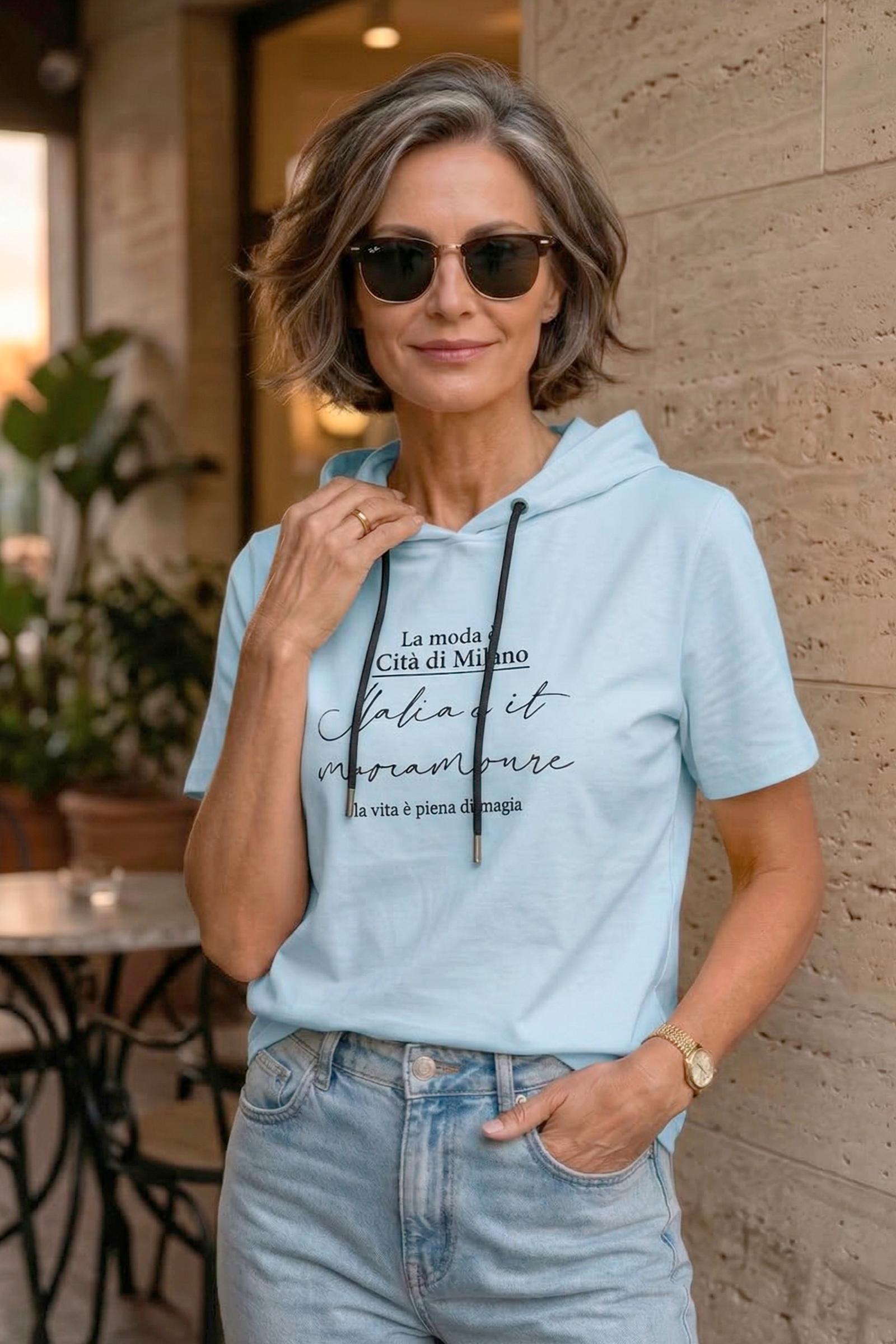 Спортивная футболка Трейси с капюшоном. Ткань Лакоста практична и удобна в повседневной носке. Футболка не мнется, пропускает воздух и максимально комфортна во время прогулок, занятий спортом или домашними делами. Стильная футболка с дизайнерским принтом и регулирующим шнурком выглядят модно и уникально.