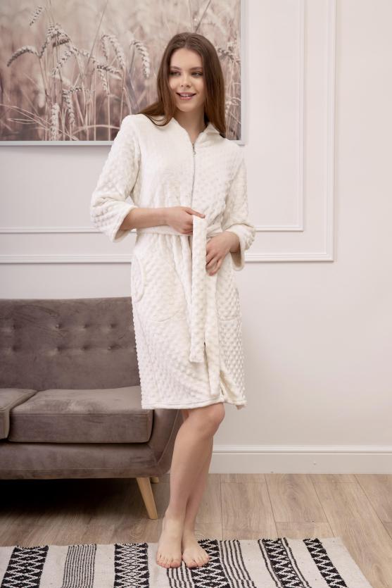 Оригинальный домашний костюм, в комплекте которого комбинированная кофта и брюки. Кофта прямого кроя со стягивающим диогональным шнурком. Рукав укороченный 3/4. Горловина V-образная. Брюки однотонные, прилегающего силуэта.
