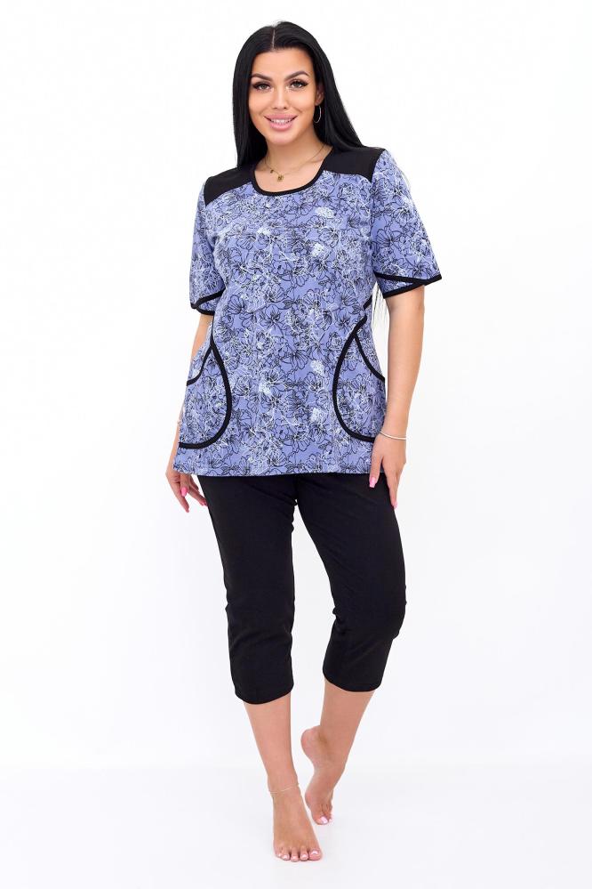 Костюм женский Дачный состоит из футболки и бридж. Футболка с карманами полуприлегающего силуэта, удлиненная, рукава короткие, горловина обработана отделочной тканью, декорирована дизайнерским принтом. Бриджи свободного кроя с высокой посадкой на талии. Широкий размерный ряд с 48 по 70 делает модель универсальной и практичной на даче, в саду или дома.