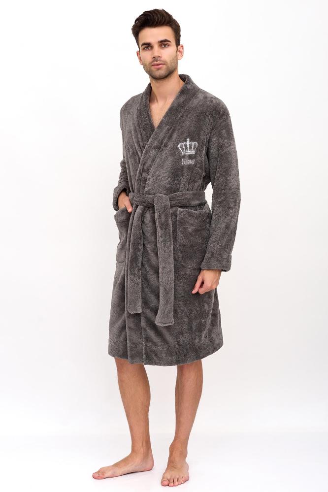 Мужской халат с поясом на запах. Длина изделия ниже колена, с двумя удобными карманами, рукав длинный. Приятный к телу халат окутает своим теплом и подарит хорошее настроение каждому «Королю». На полочке выбит соответствующий принт «Король».
