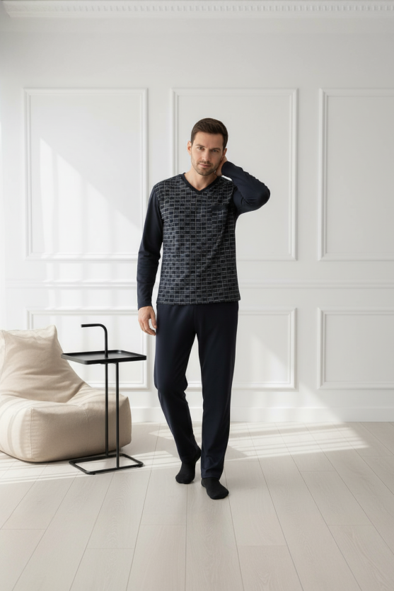 Классический набор одежды для сна. В комплект входит ночная рубашка на пуговицах и свободные брюки прямого кроя. Дизайн – геометрический узор, цвет синий. В качестве основного материала для их отшива берут либо теплую фланель, либо более легкую кулирку.