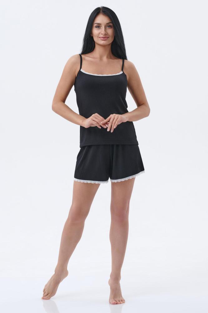 Милая женская пижама Алитея идеальна для отдыха и сна. Комплект состоит из майки и шорт, которые украшены по краю кружевом. Пижама подчеркивает фигуру, смотрится женственно и эстетично.Ткань в рубчик приятна к телу, не стесняет движений, проста в уходе.