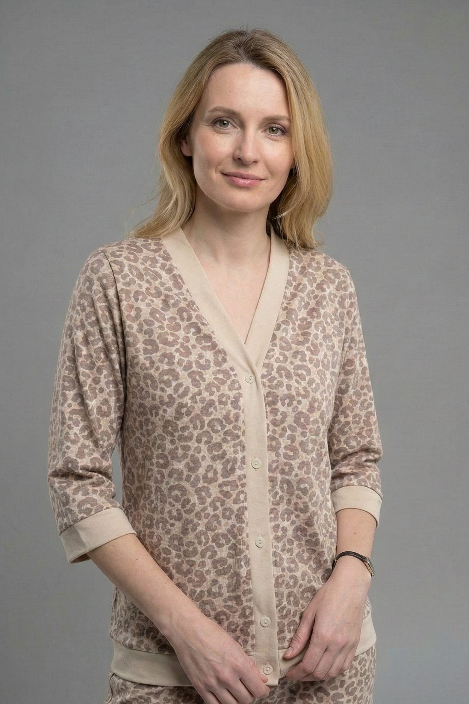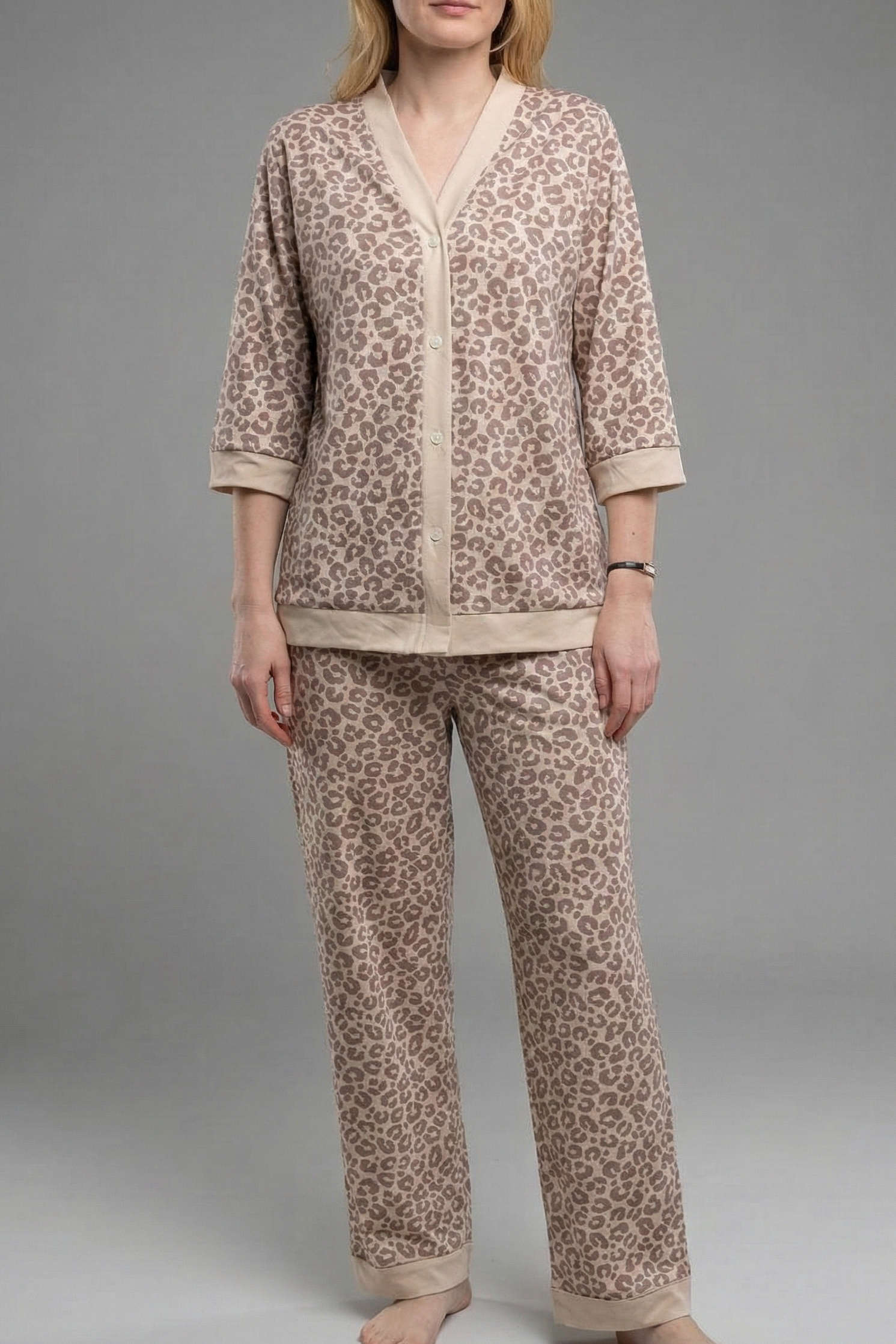 Женская пижама из 100% хлопка — идеальный вариант для комфортного сна и уютного отдыха дома. Натуральная ткань мягкая, дышащая и приятная к телу, подходит для повседневного использования в любое время года. Модель выполнена в удобном свободном силуэте, не сковывает движений и обеспечивает максимальный комфорт. Брюки на мягкой резинке, без карманов, удобно сидят по фигуре и не создают лишнего объёма. Кофта застёгивается на пуговицы, что делает пижаму практичной и комфортной в носке, а рукав длиной 3/4 обеспечивает удобство и свободу движений. Пижама отлично подходит не только для сна, но и в качестве стильного и уютного домашнего костюма. Модель представлена в широком размерном ряду и выполнена в трендовых расцветках с актуальными принтами, благодаря чему станет прекрасным подарком для родных и близких — практичным, красивым и по-настоящему комфортным.