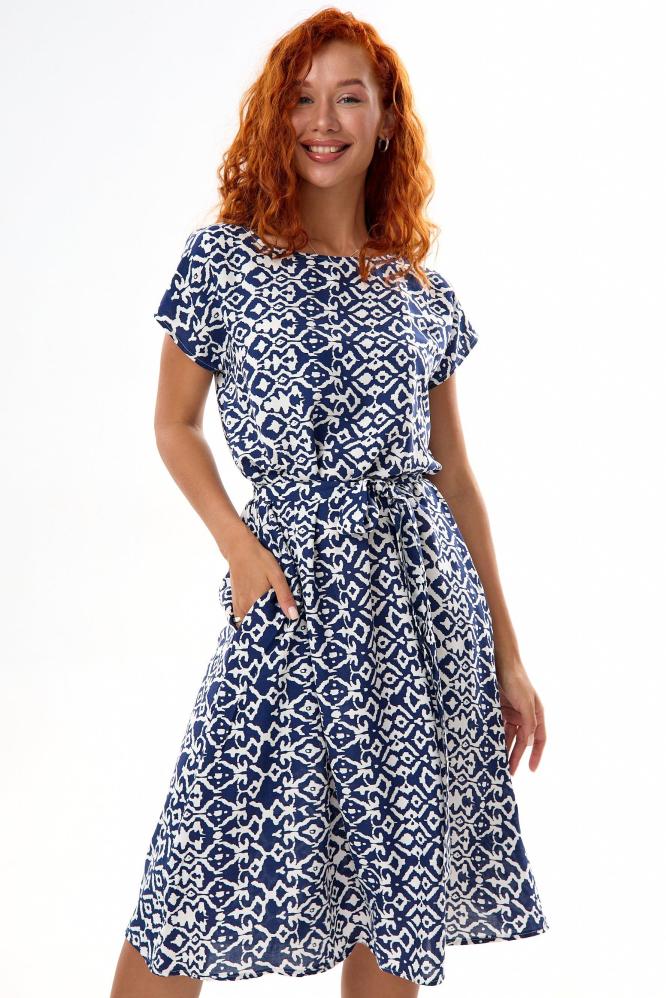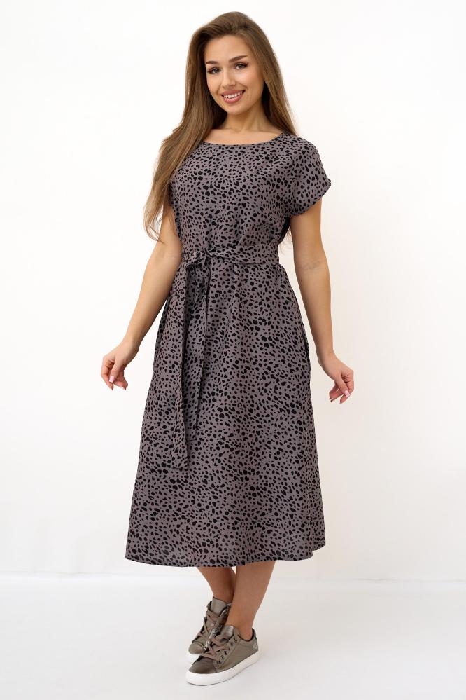 Элегантное штапельное платье длины миди. Платье свободного покроя с широким поясом на талии. Рукав короткий, цельнокроеный. При ходьбе подол красиво струится. Яркости платью придаёт цветочный принт на ткани. В таком платье можно пойти на работу, а если дополнить аксессуарами, то получится вечерний образ.
