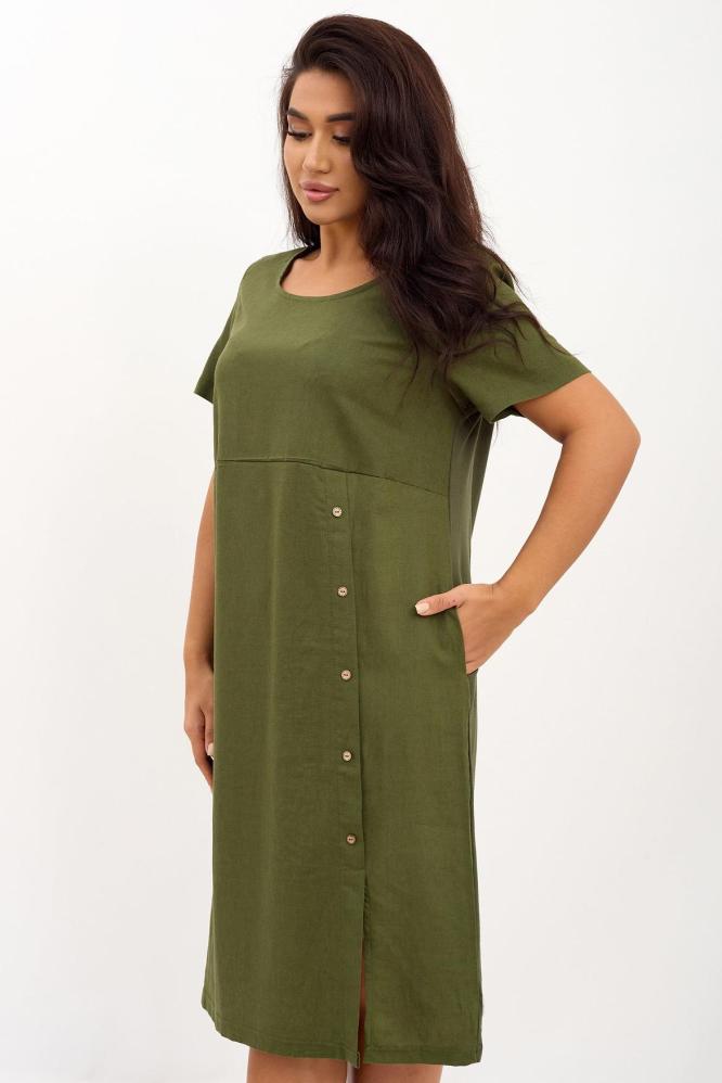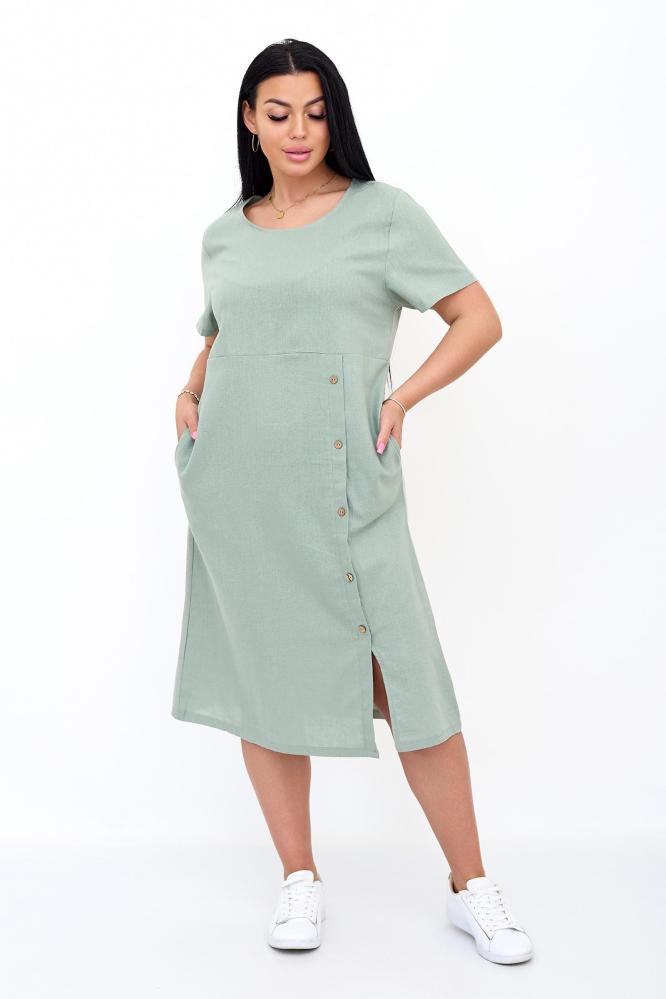Стильное однотонное платье Виктория сделает Ваш образ очаровательным и элегантным. Короткие рукава, округлый вырез горловины, длина чуть ниже колена, удобный невысокий разрез позволяет комфортно ходить. Платье с одной стороны украшено пуговицами, что придает уникальность и изысканность модели. По бокам есть удобные кармашки. Отлично подходит для прогулок, отпуска, на работу или просто в гости.