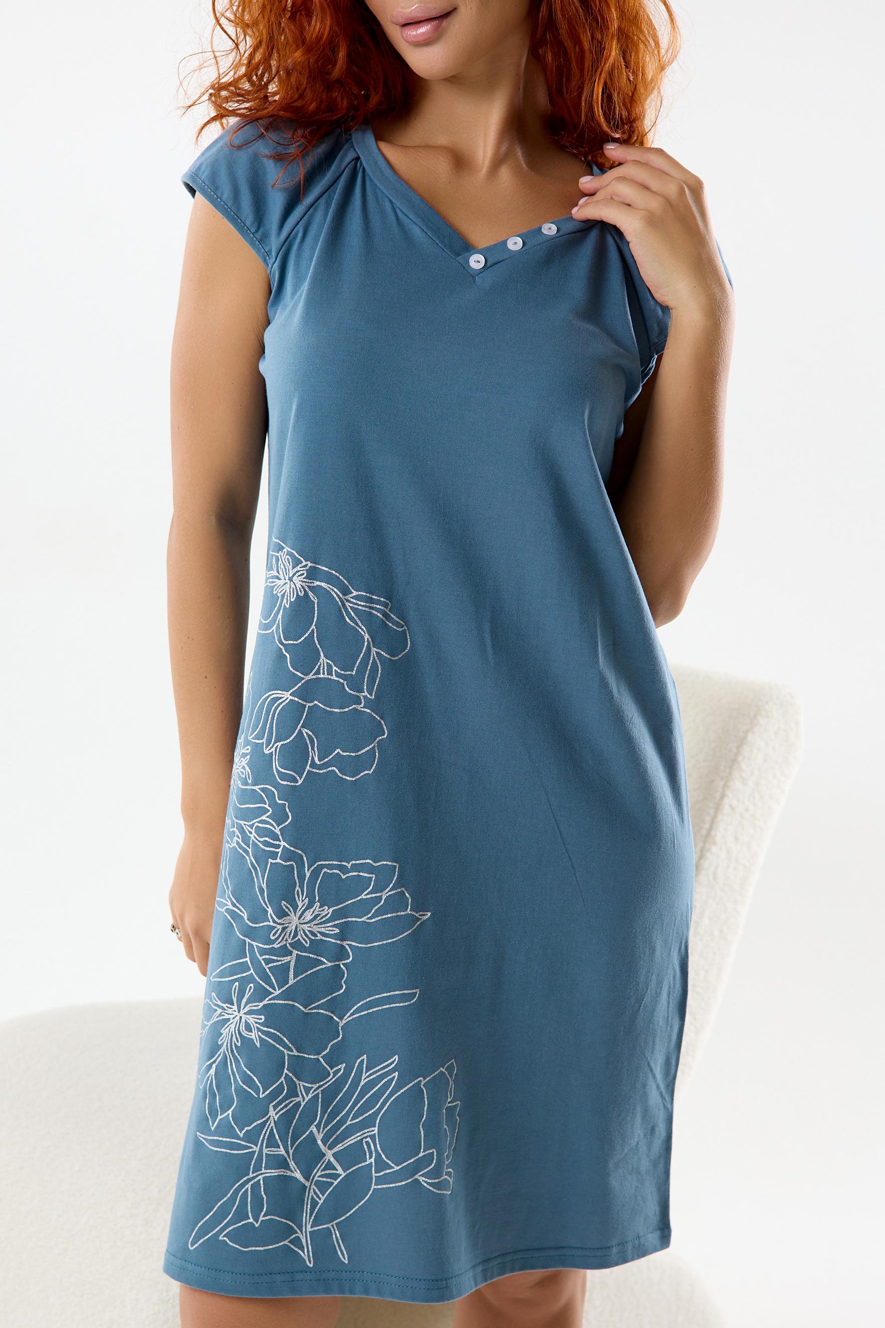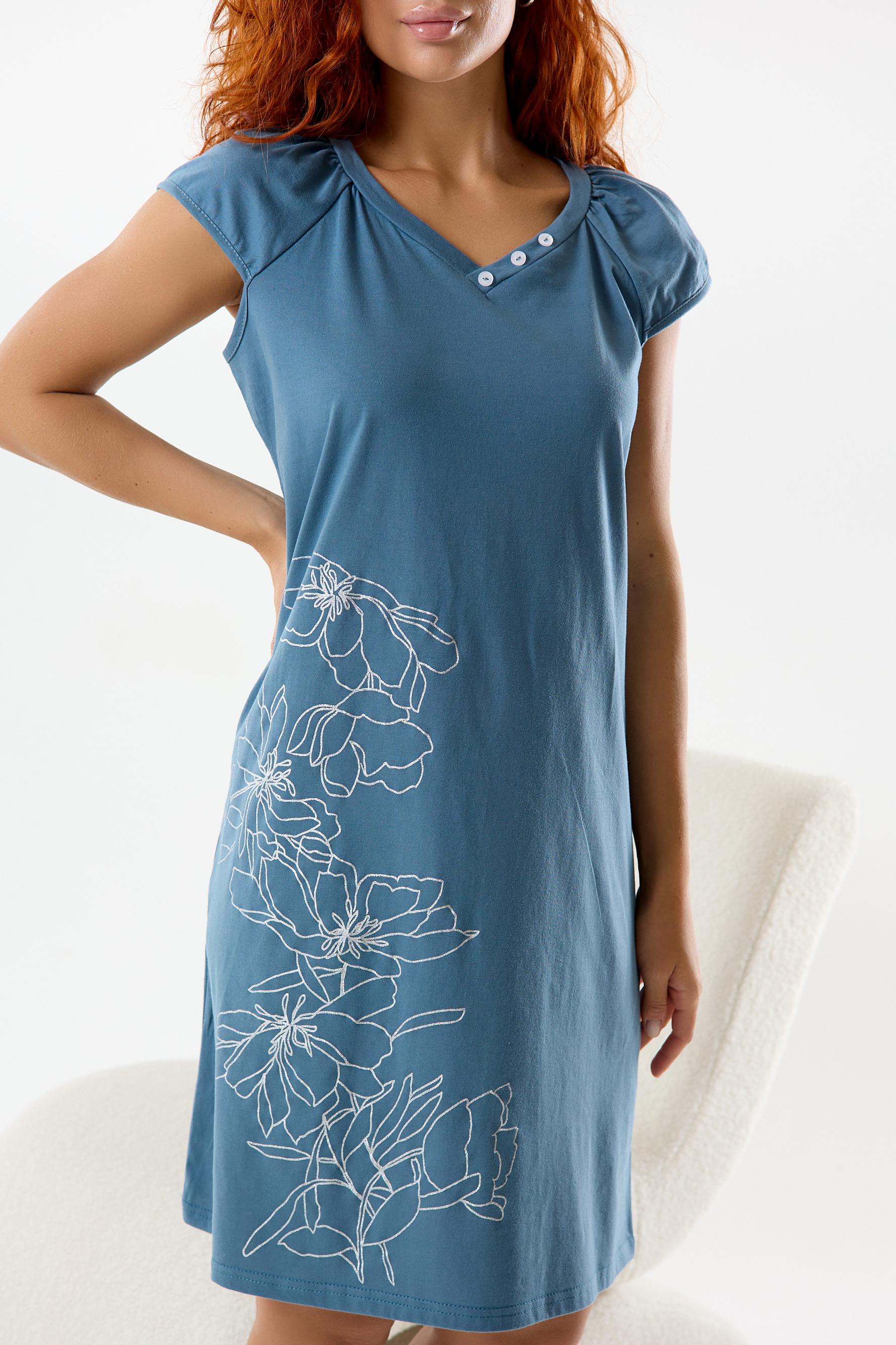 Женская ночная сорочка прямого кроя из качественного хлопкового полотна. Состав ткани и крой сорочки окунут вас в комфортный и сладкий сон. Сорочка с коротким рукавом – реглан. Красивый V-образный вырез горловины с декоративными пуговицами. Длина сорочки до коленей. Полочку украшает крупный принт в виде цветов.