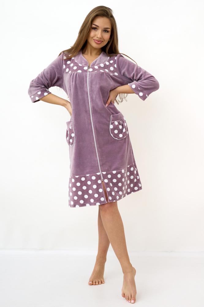 Красивый велюровый халат для дома. Застежка на молнии, свободный крой, два больших накладных кармашка для мелочей, воротник стоечка, длина до колена – все детали идеально сочетаются в модели. Удобный, повседневный женский халат для домашних дел.