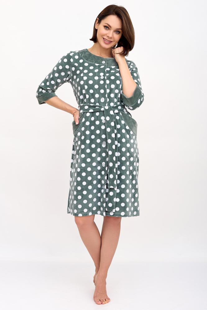 Домашний женский халат Зелма для дома и отдыха. Халат на пуговицах имеет округлый вырез, рукава длиной 3/4 , накладные вместительные карманы. Такой халат позволит выглядеть ярко, красиво и стильно. Женственный и нежный халат подарит ощущение роскоши и уюта. Также халат будет отличным подарком на любой семейный праздник.
